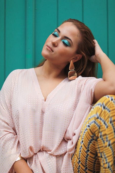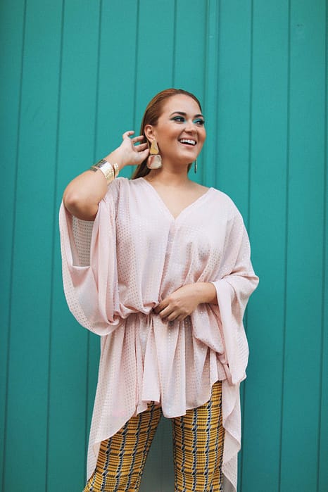 Túnica de ORLANDO EMANUEL Resort Collection combinada con pantalones Clueless y aretes dorados de Forever 21; zapatos rosados de Zara.