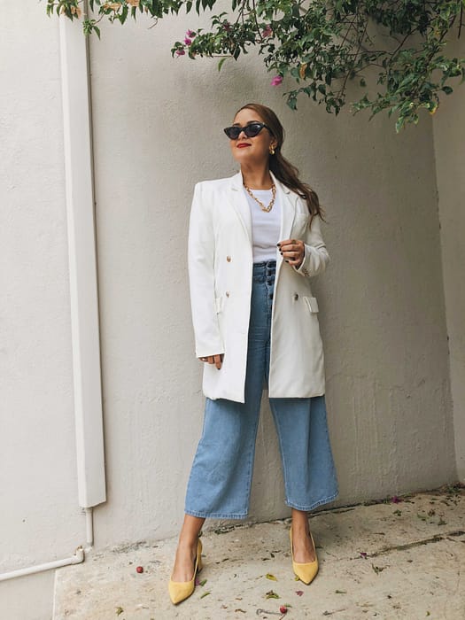 Chaqueta extra grande blanca y mahón de Forever 21; zapatos y gafas animal print de Zara; collar y aretes dorados de Uno de 50.