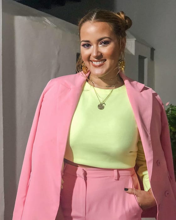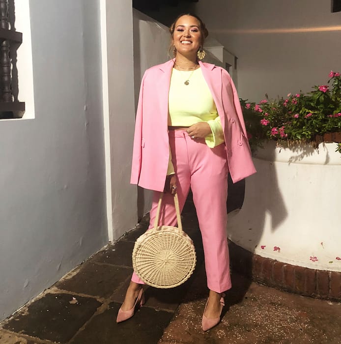Set de chaqueta y pantalón de Suit Number Nine; crop top sweater neon y tacones de Zara; cartera de Aldo.