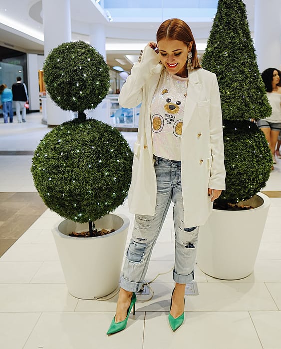 Este es el atuendo que utilicé para hacer la entrevista. Quería un look que fuese profesional, pero chic y divertido. Así que este blazer de botones de Forever 21 lo combiné con unos boyfriend jeans de American Eagle, top de lentejuelas de Capture Glamour y unas pantallas doradas y de flecos de H&M. Para resaltar aún más, rompí la neutralidad con unos zapatos verdes de Zara y un labial red-orange.