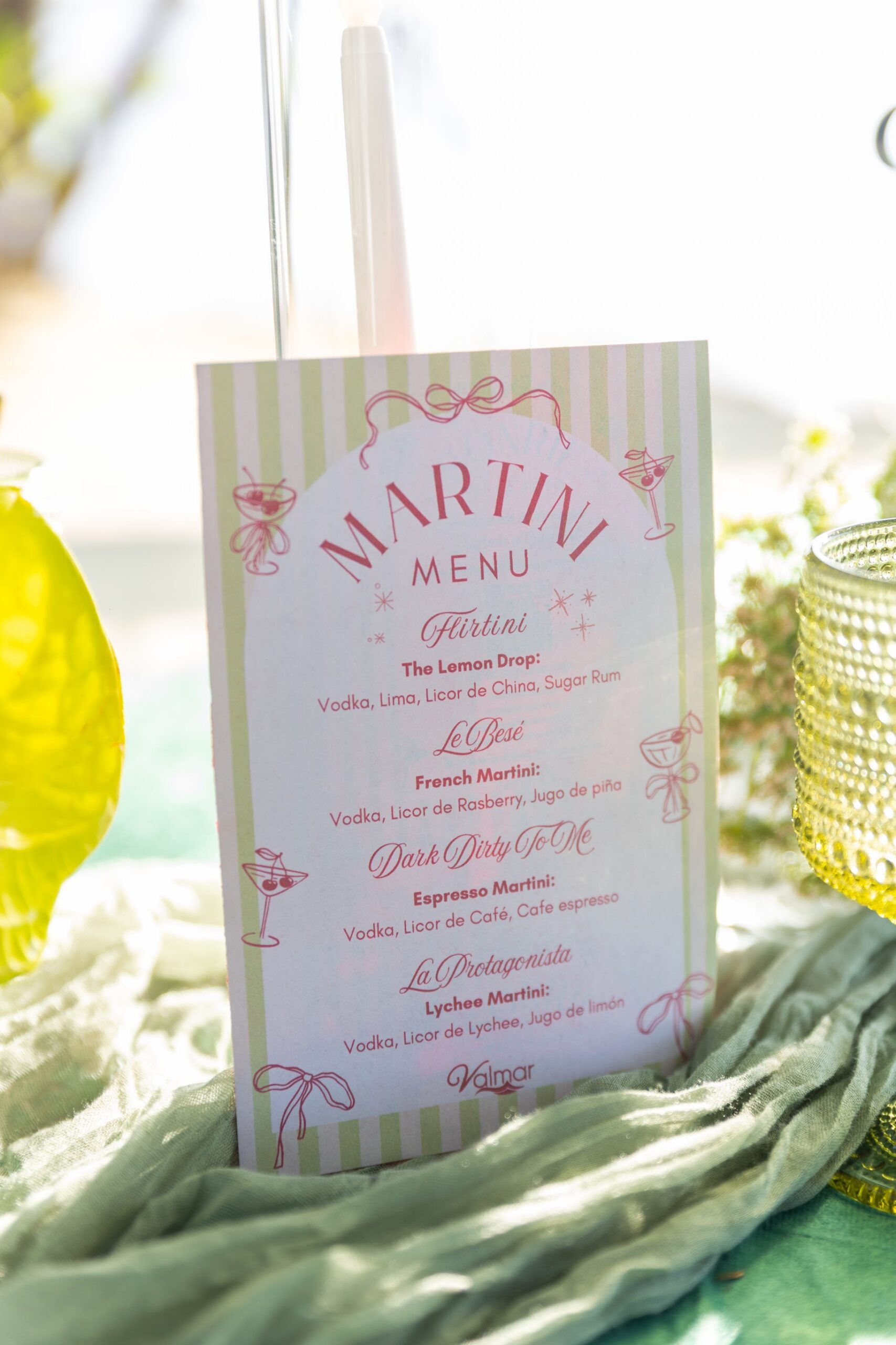 Para romper el hielo, recibimos a los invitados con una carta de martinis personalizados que diseñé, junto al equipo de Valmar, con nombres llenos de personalidad: