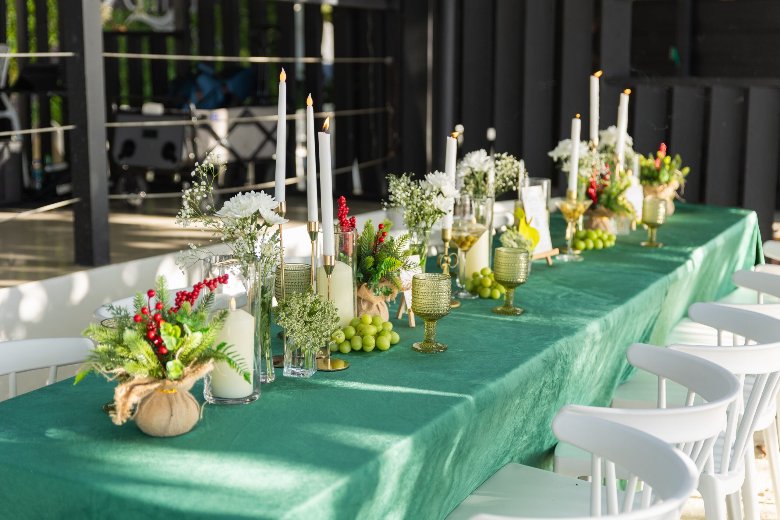 3. Mesa Familiar: Una combinación clásica con uvas y detalles en rojo vibrante. Como la aceituna tiene ese corazón rojo, quise que el color salpicara en la decoración (¡y en mi atuendo! –ya mismo hablamos del outfit).