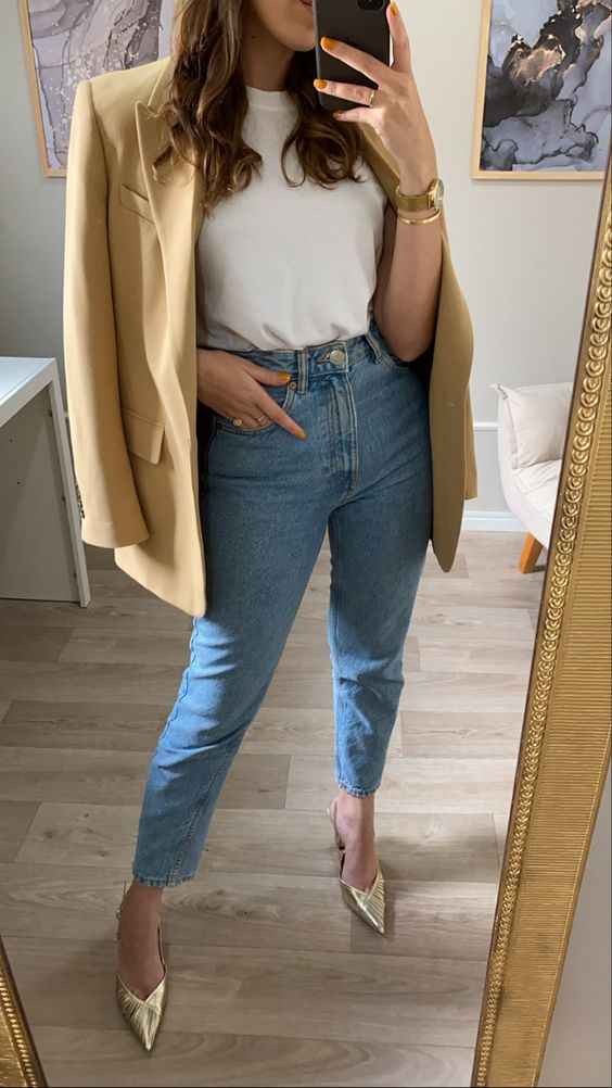 No es lo mismo tener una camisa básica blanca con un mahón boyfriend que tener una camisa básica blanca con un mahón, y por encima un a chaqueta negra. Y si seguimos el consejo anterior, le añadimos unas Ray-bans clásicas negras y accesorios minimalistas dorados y estás lista para un día de trabajo, y que conste, ¡en mahones!
