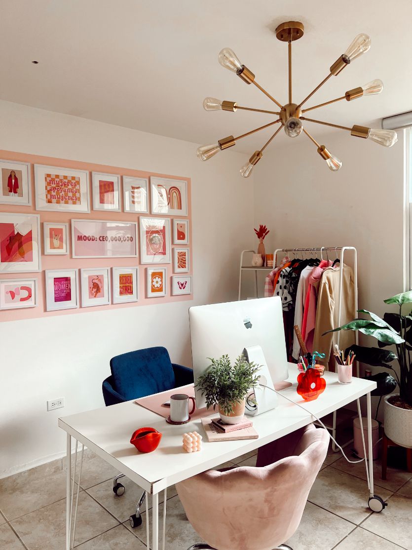 Mi pareja me dio la idea de enmarcar con pintura rosa el espacio donde se colocarían los cuadros, y me pareció un detalle genial para resaltar el efecto de la galería. De hecho, fue él quien se encargó –gracias mi amor– del proyecto de medir las distancias y determinar dónde se colocaría cada clavo y cuadro para que quedara montado visualmente armonioso. Es una de las primeras cosas que ves al entrar a la oficina y también es el fondo perfecto para mis llamadas y reuniones virtuales, selfies y fotos bonitas.