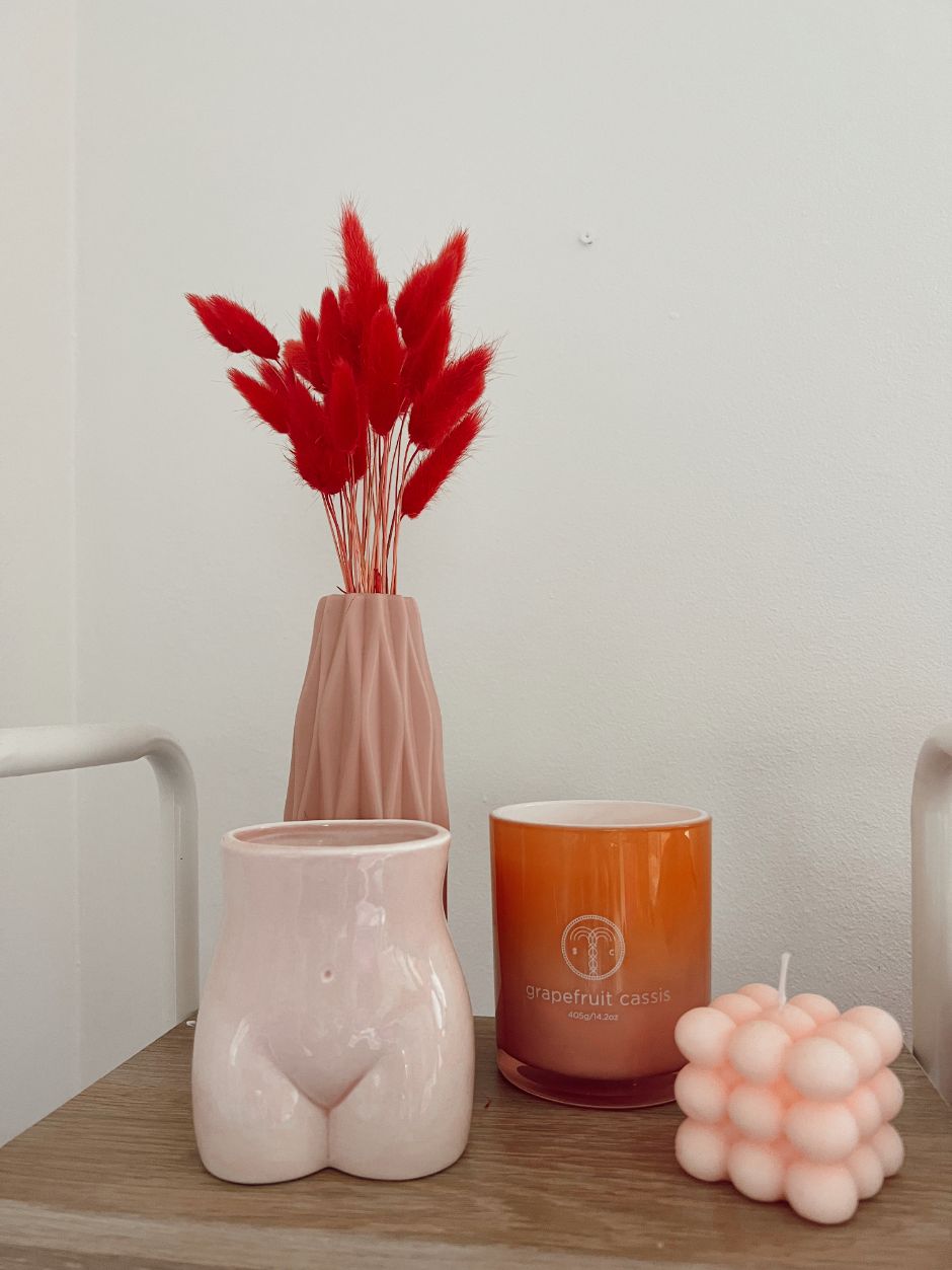 Allí, coloqué más velas, entre ellas la vela en espiral, la vela de curvas color crema, y la mano acrílica en color rosa, que te sirve para poner joyería o simplemente decorar y/o recordar que todo está de show, no importa lo que pase. 👌🏼