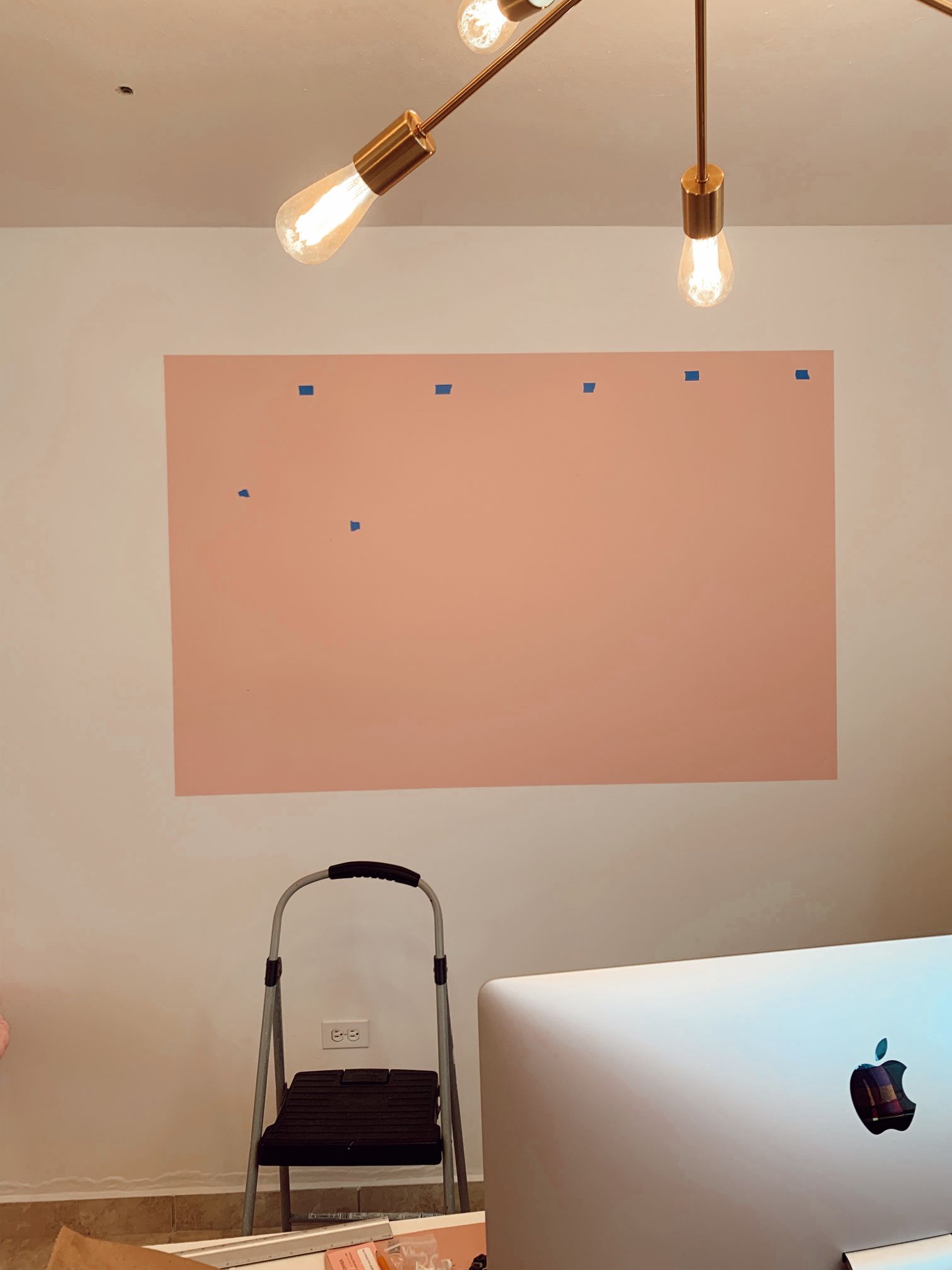 Antes de comenzar a pintar y haber escogido la pintura, Lorena me envío tres opciones de diseño que giraban alrededor de la idea de curvas para que yo escogiera el más que me gustara. El número uno me encantó, además que se incorporaría muy bien con el mueble anaranjado que buscaba acomodar en la pared. ¡Ahora a pintar!