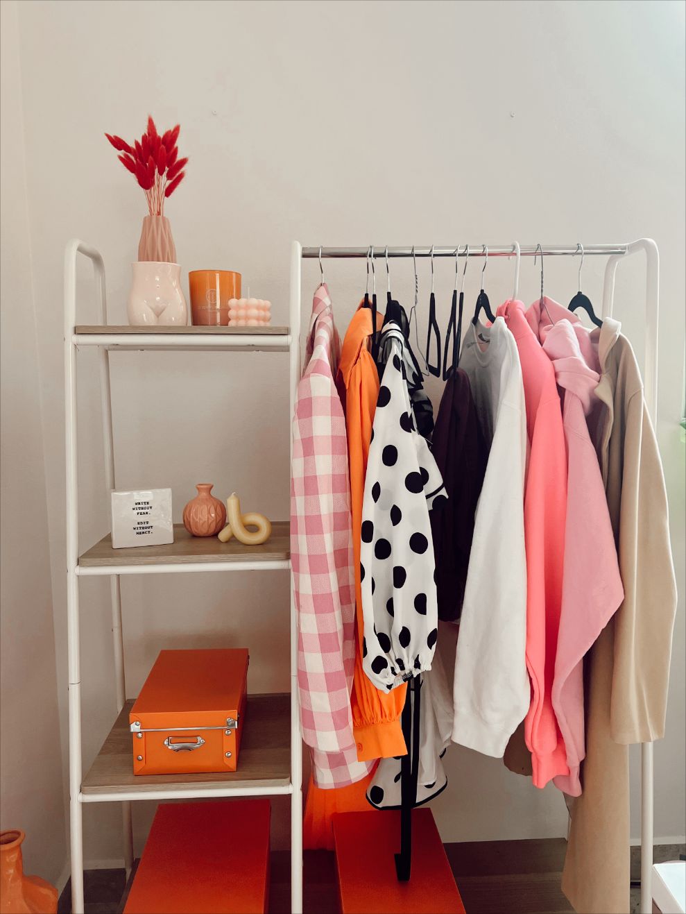 Estas velas de círculos son visualmente satisfactorias lol y la vela amarilla con una forma curiosa la puedes conseguir aquí, junto a otros colores y formas. Huelen riquísimas, aunque ni siquiera las prenda, que realmente no lo haré porque son demasiado bonitas. El jarrón del cuerpo femenino desnudo me recuerda todo lo que represento en mi naturaleza. También lo puedes poner de espalda para que sea vean las nalguitas bien cute. Con esto, junto al jarrón plástico rosa, creé un conjunto bonito de elementos a resaltar en las tablillas del rack de ropa. Mientras que en las tablillas restantes, aproveché para ubicar cajas de storage, que me hicieran accesible mis documentos importantes, herramientas y materiales.