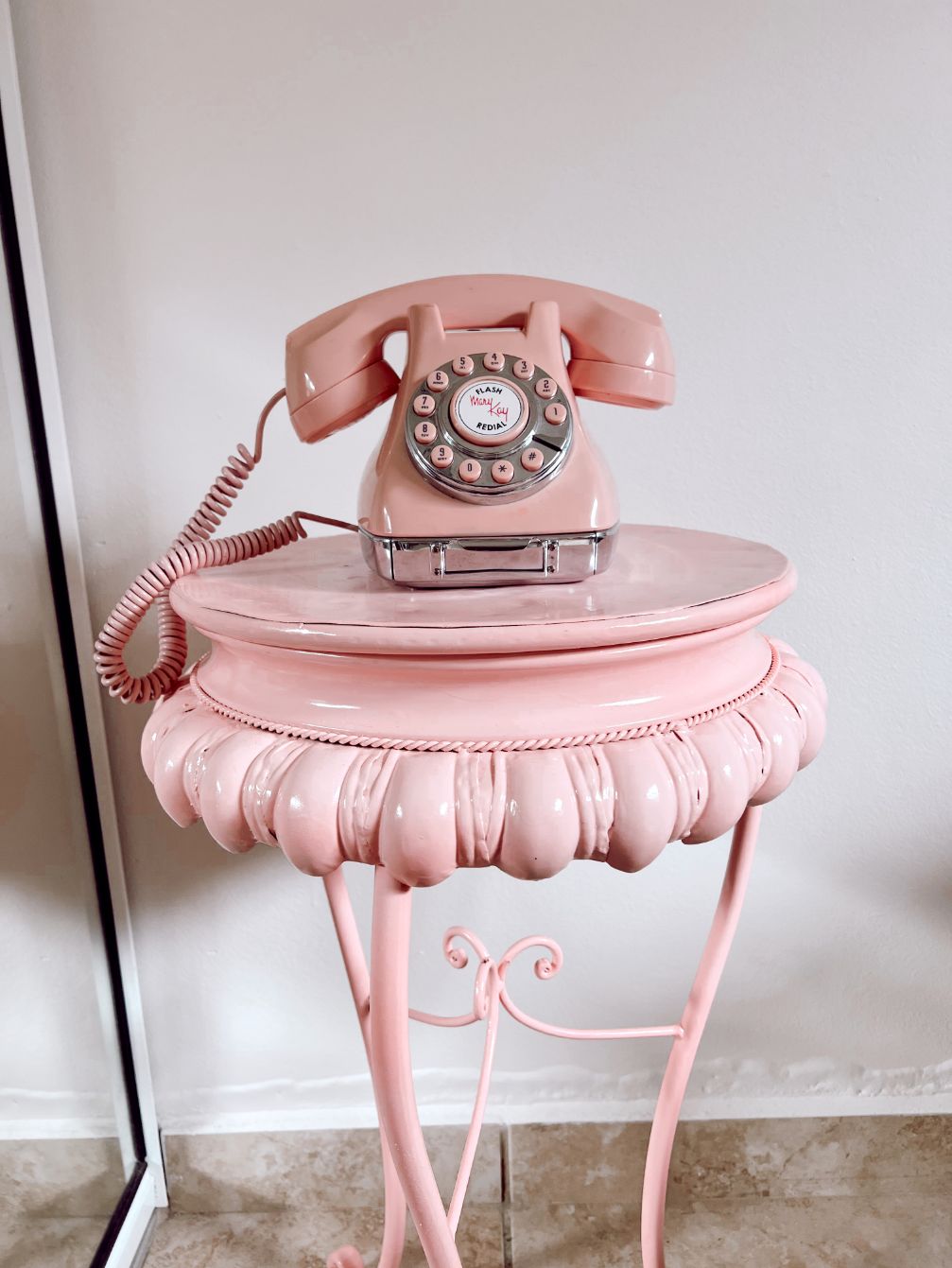 Luego de secarse, qué mejor lugar para colocar un teléfono vintage en color rosa que me regaló una de mis mejores amigas.