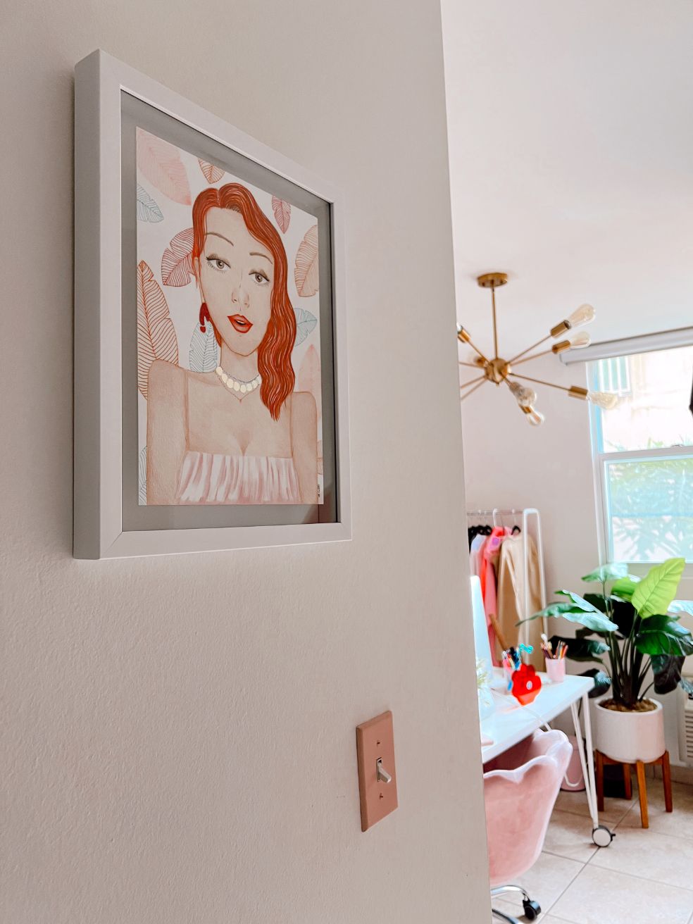 Mi pareja me dio la idea de enmarcar con pintura rosa el espacio donde se colocarían los cuadros, y me pareció un detalle genial para resaltar el efecto de la galería. De hecho, fue él quien se encargó –gracias mi amor– del proyecto de medir las distancias y determinar dónde se colocaría cada clavo y cuadro para que quedara montado visualmente armonioso. Es una de las primeras cosas que ves al entrar a la oficina y también es el fondo perfecto para mis llamadas y reuniones virtuales, selfies y fotos bonitas.