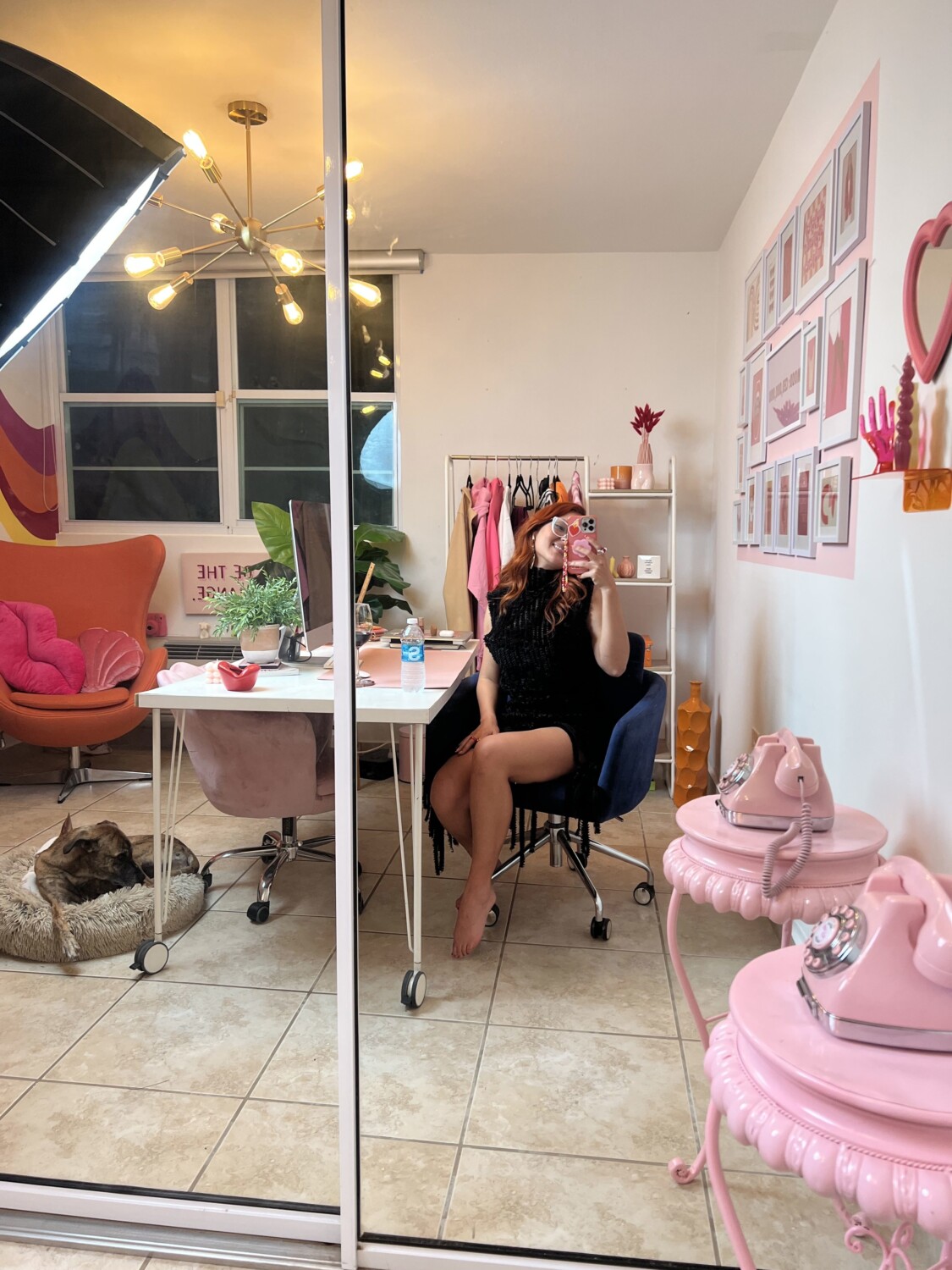 Una de las primeras decisiones a tomar son los colores que predominarán en tu espacio. Puedes tener dos colores que sean los principales, y un tercero –o secundarios– que rompa con el contraste de los anteriores. Busca esas tonalidades que provoquen una emoción o que te simbolizen un sentimiento para ti. En mi caso, quería que mi home-office tuviera también los mismos colores de mi marca personal, que son rojo, anaranjado y rosa. Al final del día, ahí es donde creo todo lo relacionado a ella. Así una vez tengas claro eso, es más fácil proceder a diseñar el mockup de la habitación.