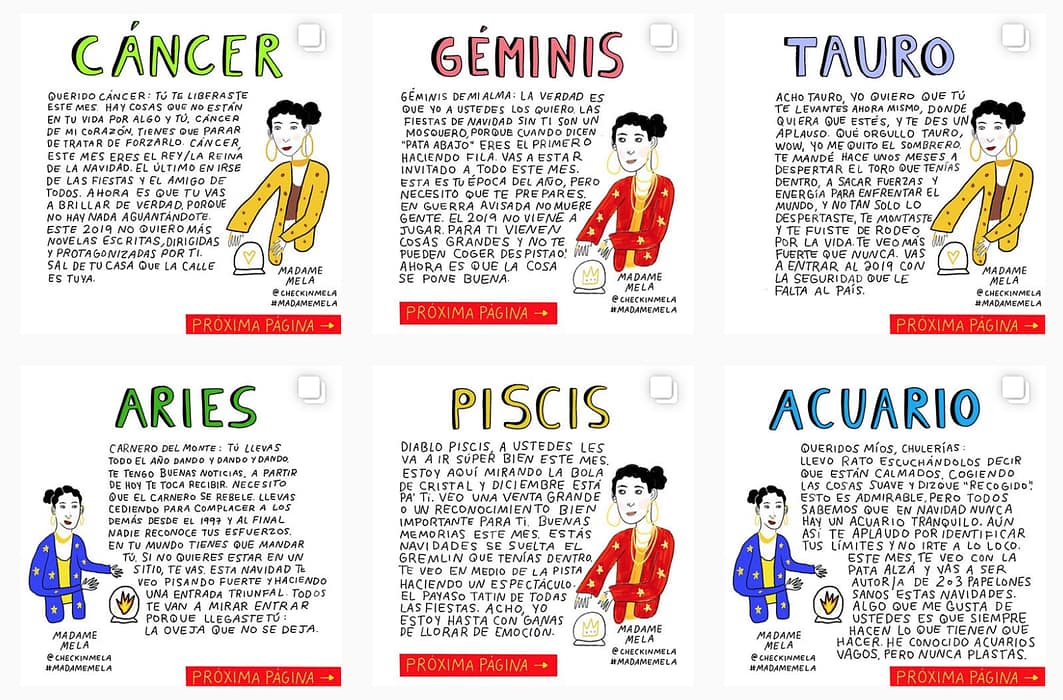 Su sección del horóscopo, Madame Mela, y recientemente, Querida Mela, una colección de consejos ilustrados, le han ganado popularidad en las redes gracias a sus ocurrencias, humor y escritura creativa.