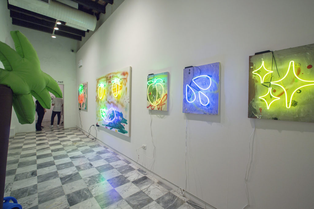 Por último, los veteranos del arte local Bobby Cruz e Ivelisse Jiménez presentaron respectivamente sus piezas: él destacando el neón entre emojis, ella en una colorida investigación artística de la huella que deja el agua sobre plástico.