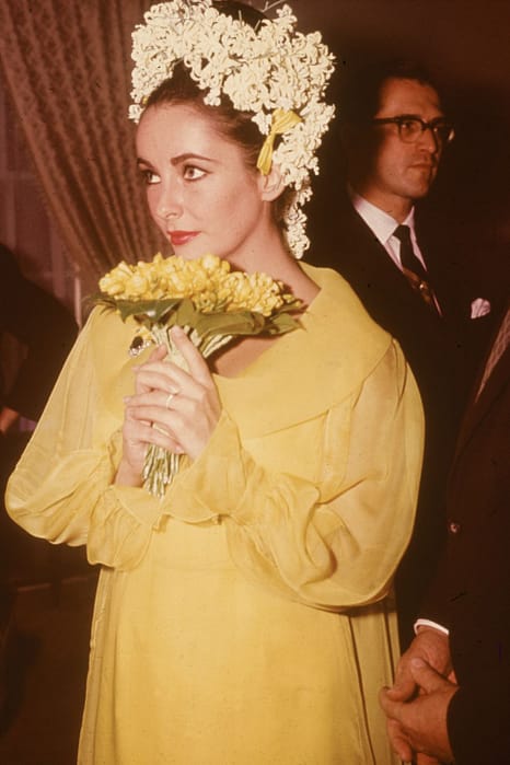 Elizabeth Taylor en la década de los ’60 llevando un traje amarillo, optimista, alegre e inspirado en Cleopatra.
