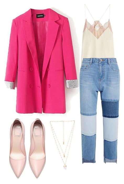 Un look para esas chicas fashionistas que les gusta verse femeninas y siempre set. Ideal para un trabajo en la industria de la moda, ya sea estilista, makeup artist o stylist. Variando con el color de la chaqueta puedes llegar al balance deseado, o más seria o más espontánea. La chaqueta es necesaria porque la blusa de adentro tiende a verse sexy, y sin la misma podrías estar llevando la impresión incorrecta.