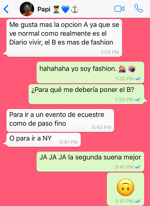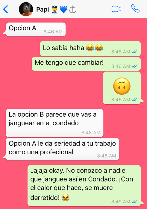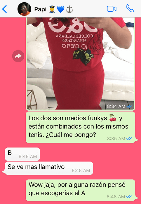 Me gustaba el de la izquierda porque era más casual. Los viernes en el trabajo es bien relax, cuando saliera me podía poner un lipstick rojo, me soltaba el pelo, ¡y listo! Pero, papi tenía otro pensar.