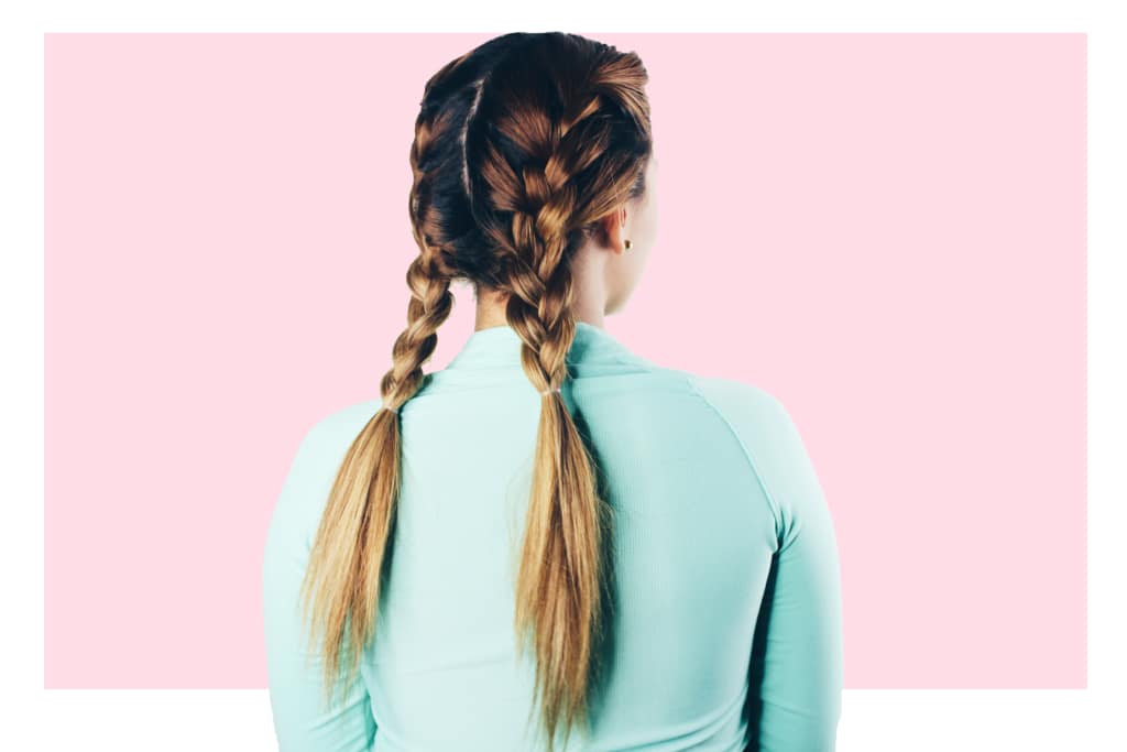 Dos trenzas clásicas para hacer ejercicio es incómodo. Punto. Sin embargo, esta versión es todo lo contrario. Con todo el cabello hacia atrás en una trenza fransesa, y el resto del cabello en dos colas, podrás brincar, correr y realizar movimientos de alto impacto sin que el pelo te moleste. Puedes variarlo, con dos donas, en lugar de moños, o incluso, amarrar las dos trenzas en un solo moño. ¡Cualquier opción es buena!