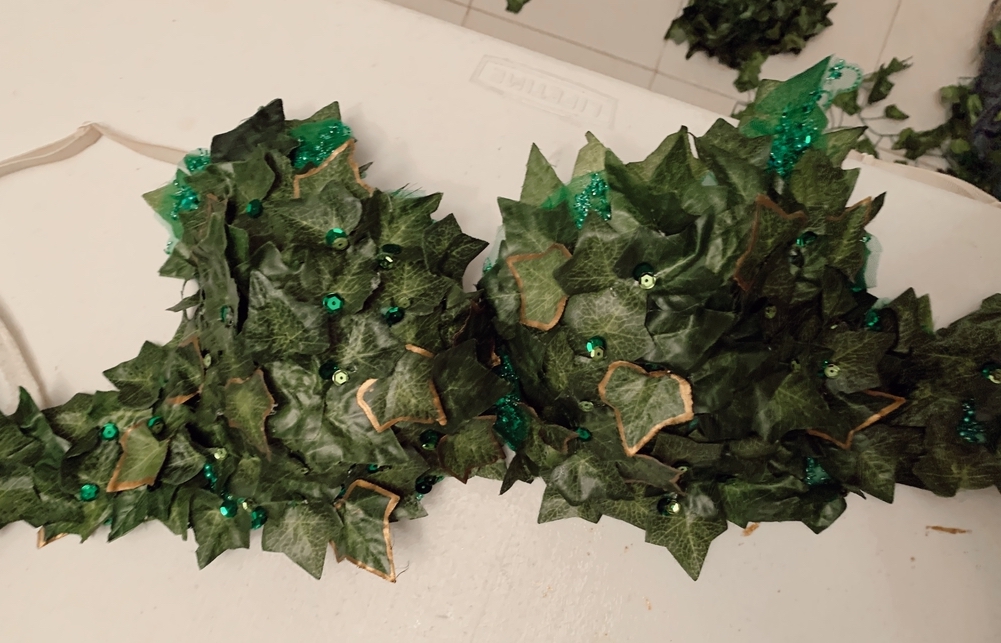 Cuando llegaron, las vi muy verde clarito así que las personalicé: las pinté más oscuras, añadí toques de pintura dorada y florecitas verdes de la tela que usé para el brasier… tú sabes, para darle ese toquecito extra que convierte un disfraz en un fashion statement.