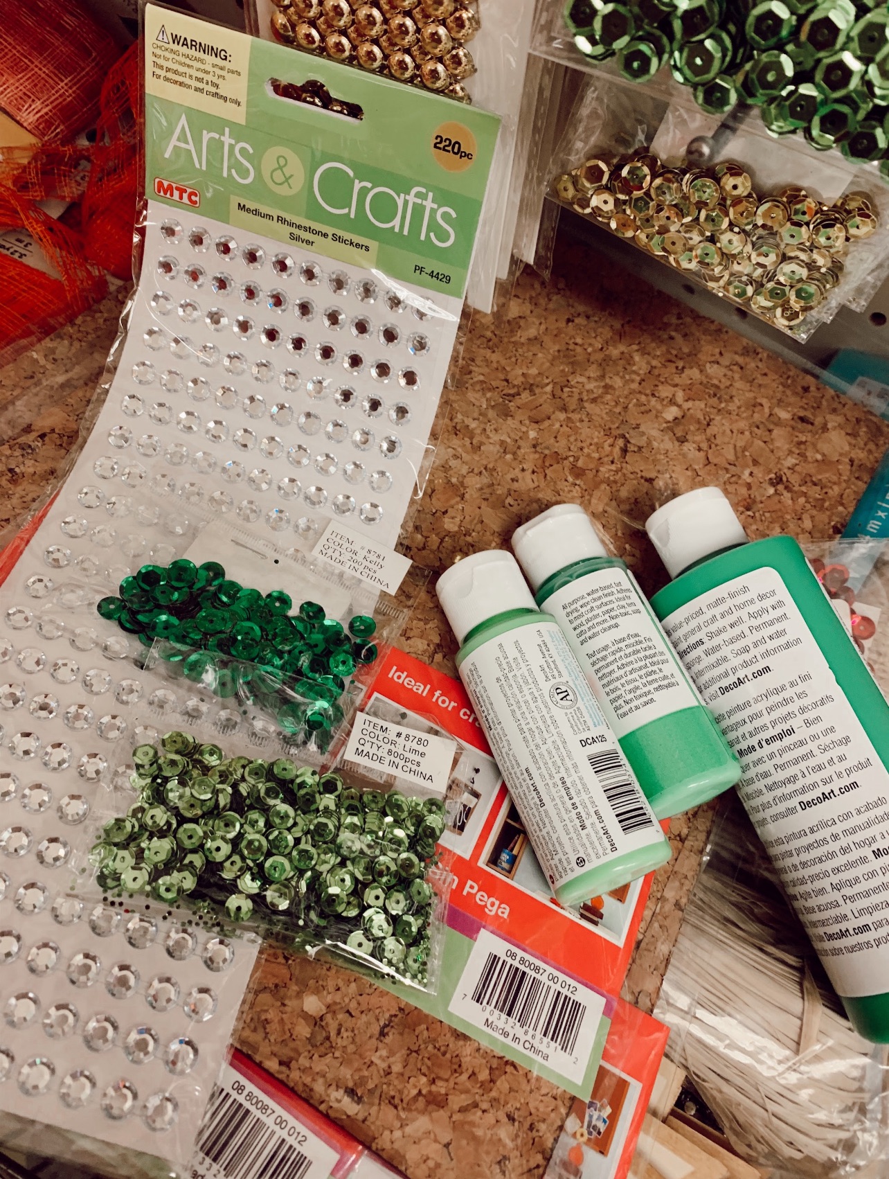 - Para crear unos guantes de mano, tomé unas pantimedias color verde, las corté y luego pegué en cada borde más hojas y lentejuelas verdes.