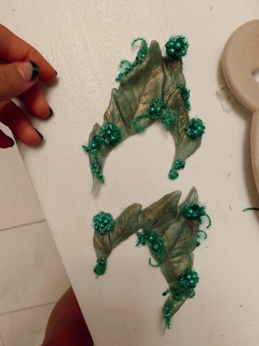 Cuando llegaron, las vi muy verde clarito así que las personalicé: las pinté más oscuras, añadí toques de pintura dorada y florecitas verdes de la tela que usé para el brasier… tú sabes, para darle ese toquecito extra que convierte un disfraz en un fashion statement.