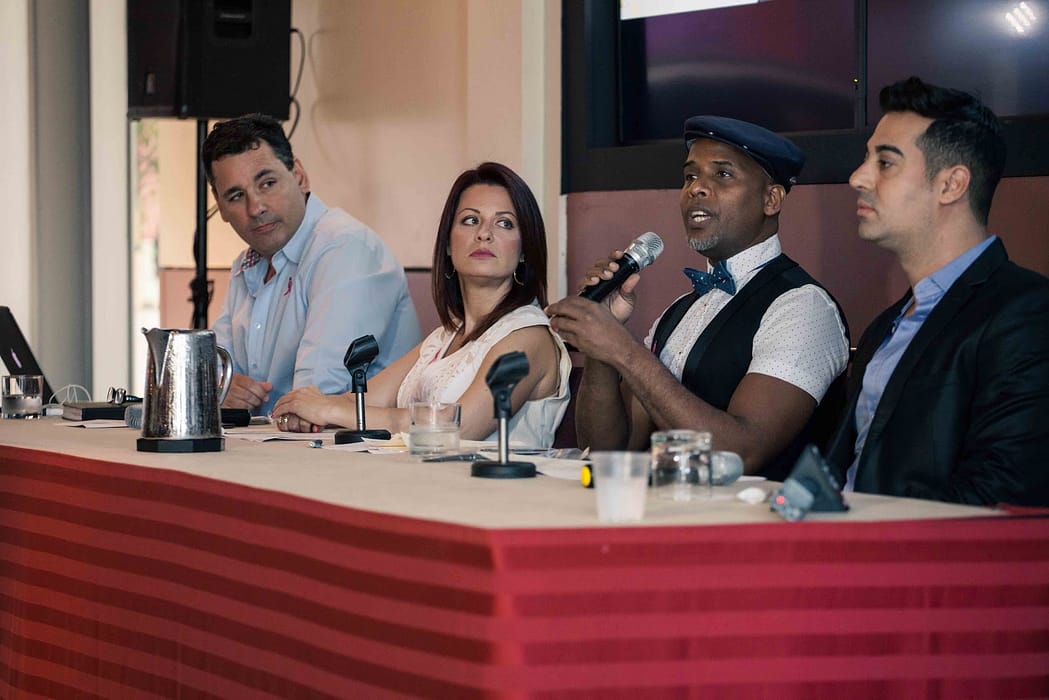 De izquierda a derecha, Fabián De La Fuentes, diseñador puertorriqueño de joyas, y Karla Mercado, del blog The Trend Oven, con Nathasha Bonet.