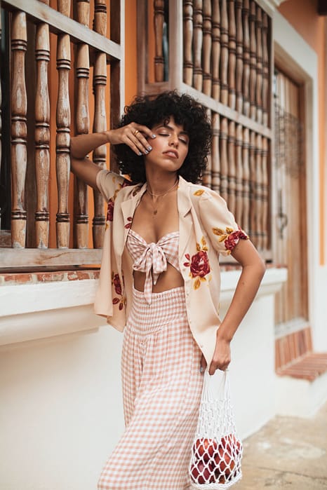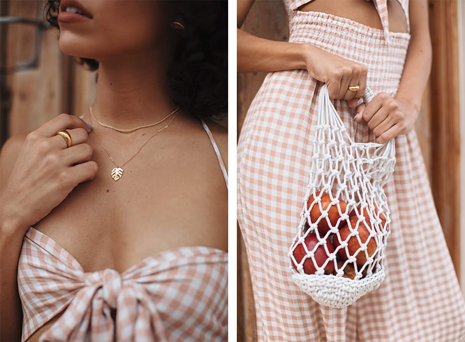 Aurora Ring styled with Leaf and Curb Chains from Muns Jewelry; pink gingham jumpsuit combined with roses top and crocket knit white bag from Nude.