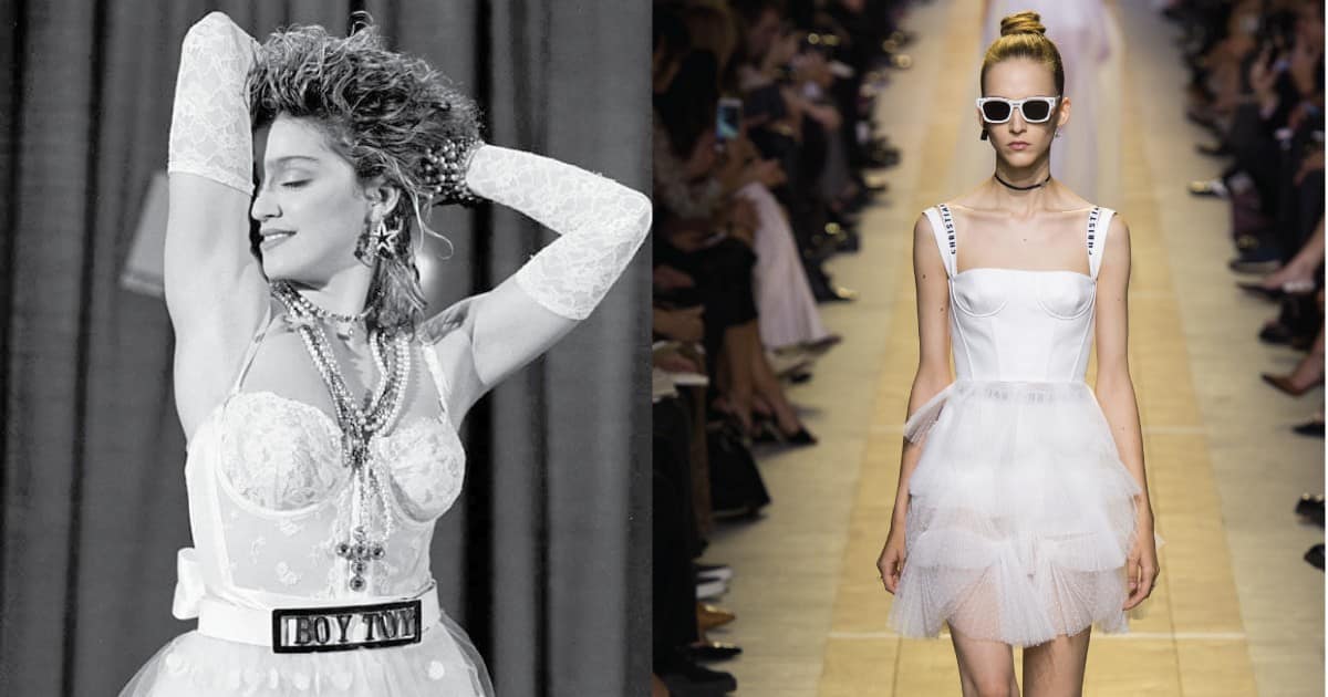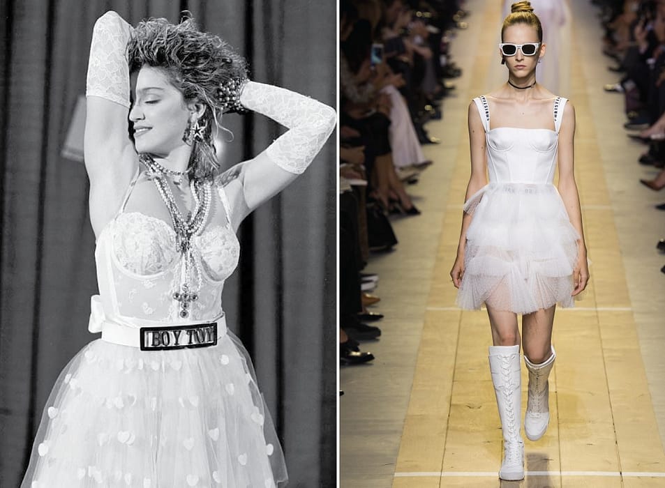 A mano izquierda, Madonna en la década de los ochenta y a mano derecha, uno de los looks del reciente desfile de Dior Spring 2017.