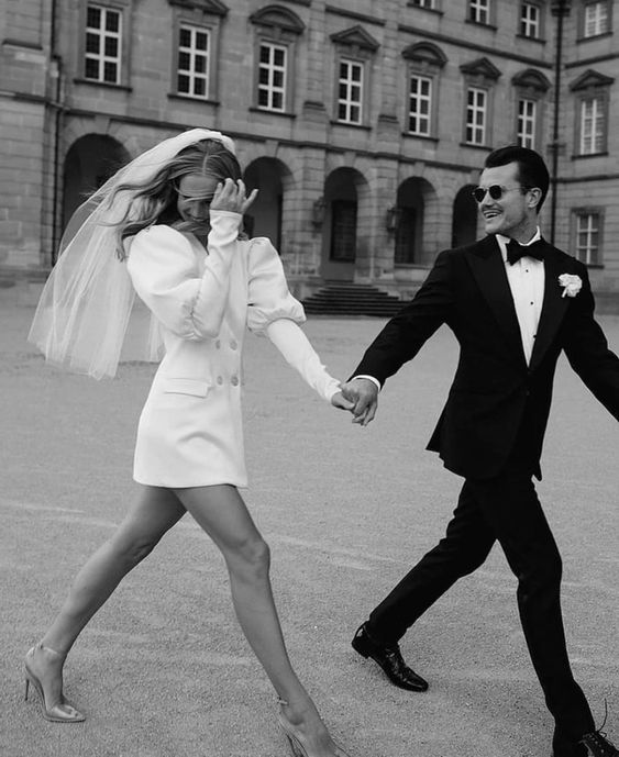 Si quieres que tu personalidad emprendedora se sienta marca, los blazers son excelente opción para recordarle a tu pareja que aquí no hay roles de género y tú te pones lo que te dé la gana. Las chaquetas no tienen que ser solo para el sexo masculino el día de tu boda. Puedes usar un set de pantalón y chaqueta, o un blazer dress corto que enseñe tus piernas. Los accesorios son siempre la clave para lograr esa fórmula mágica. Ya sean medias blancas con adornos, unos zapatos statement, muchos collares o un sombrero, el día de tu boda las reglas las pones tú.